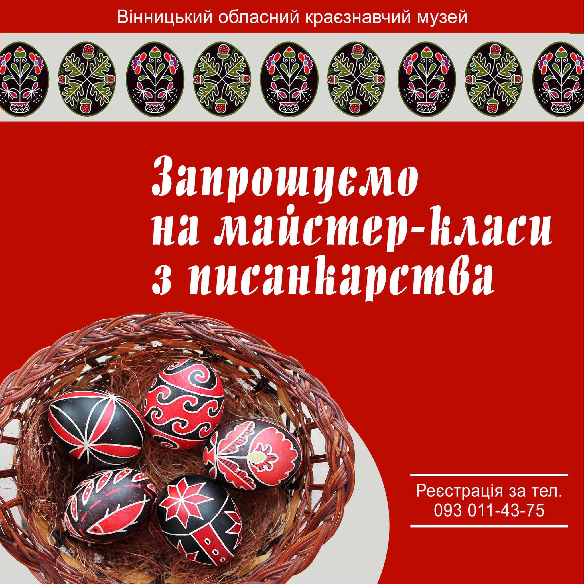 У Вінницькому обласному краєзнавчому музеї організовують майстер-класи з писанкарства для організованих груп. До участі запрошують шкільні колективи та інші групи до 20 осіб.