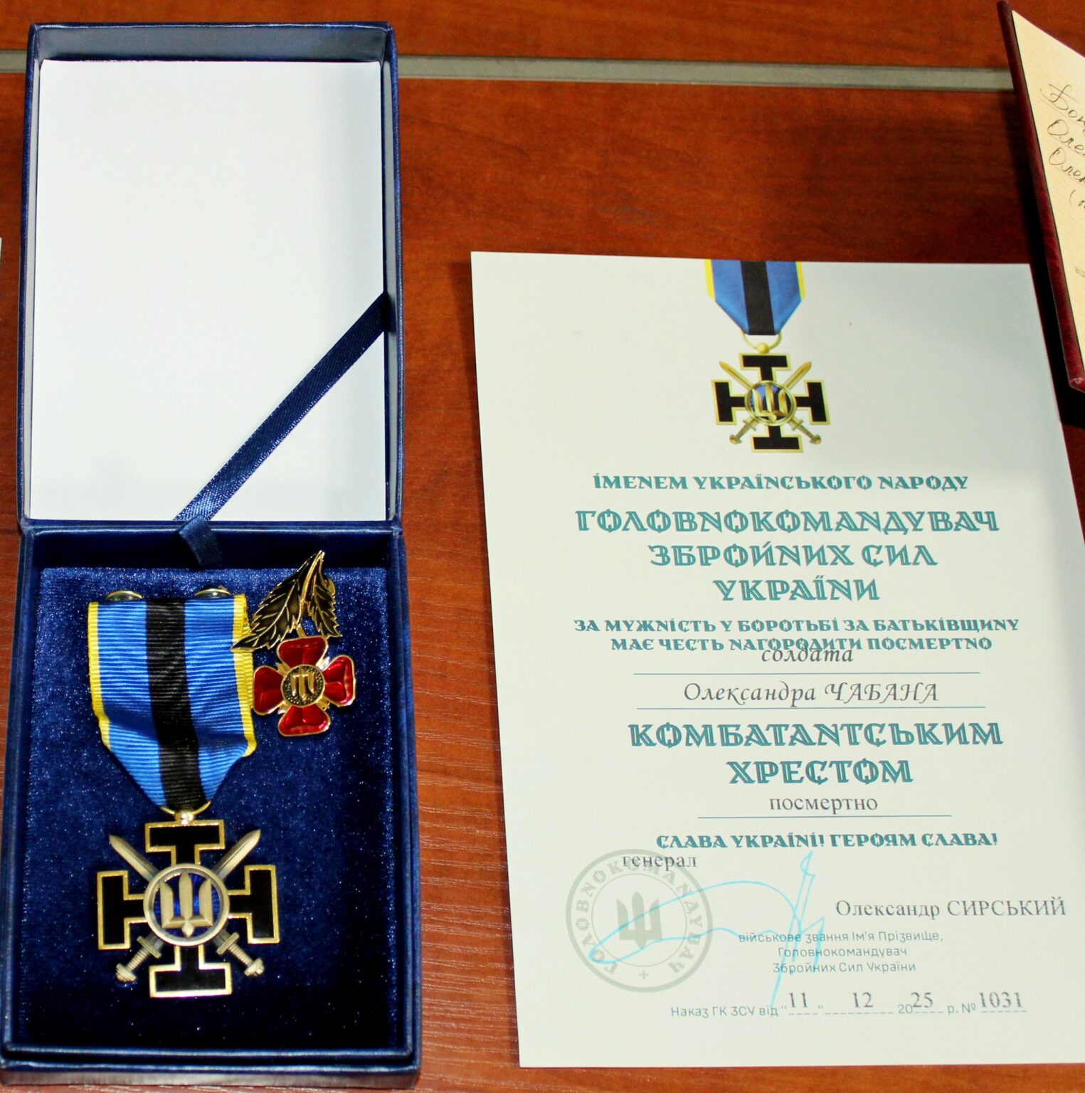 Почесний нагрудний знак Головнокомандувача ЗСУ «Комбатантський хрест» та знак «Честь та пам’ять» посмертно вручено родині солдата Олександра Чабана — стрільця-помічника гранатометника військової частини А4718. Воїн загинув 9 вересня 2024 року під час бою за Україну, отримавши поранення, несумісні з життям.