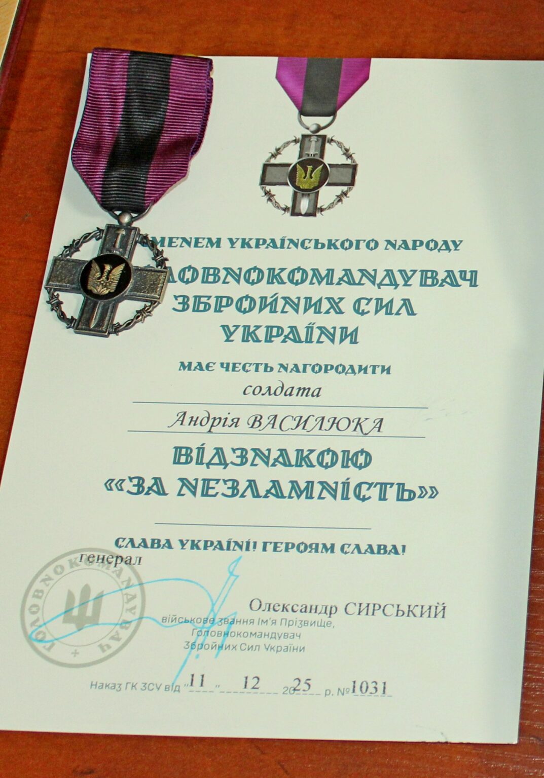 Орденом «За мужність» ІІІ ступеня посмертно відзначено солдата Павла Жуковського — номер обслуги механізованого відділення військової частини А4699. Воїн загинув 26 листопада 2023 року поблизу населеного пункту Степове Покровського району Донецької області.